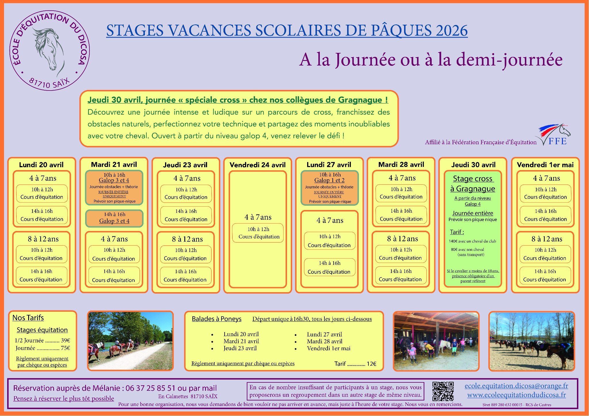 Pensez à reserver le plus tôt possible, par mail ecole.equitation.dicosa@orange.fr